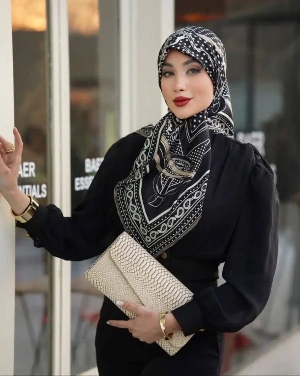 از نظر استایل، روسری ابریشم تووییل Ti003 بافت بسیار خوبی دارد. یعنی روی سر یا شانهها بهزیبایی مینشیند و حالتی منظم و خوشفرم ایجاد میکند. با وجود اینکه جنس ابریشم معمولاً کمی لیز است، بافت کجراه این روسری، لیز و سُر نیست و بهخوبی روی سر فیکس می ماند. این ویژگی آن را برای استفاده طولانیمدت، مهمانیها، یا حتی استایل روزمره کاملاً مناسب میکند. طرحهای گرافیکی و هندسی روی پارچه ترکیبی از نقطهها، خطوط و موتیفهای ظریف هستند که جلوهای مدرن در کنار حسی کلاسیک به روسری میدهند.